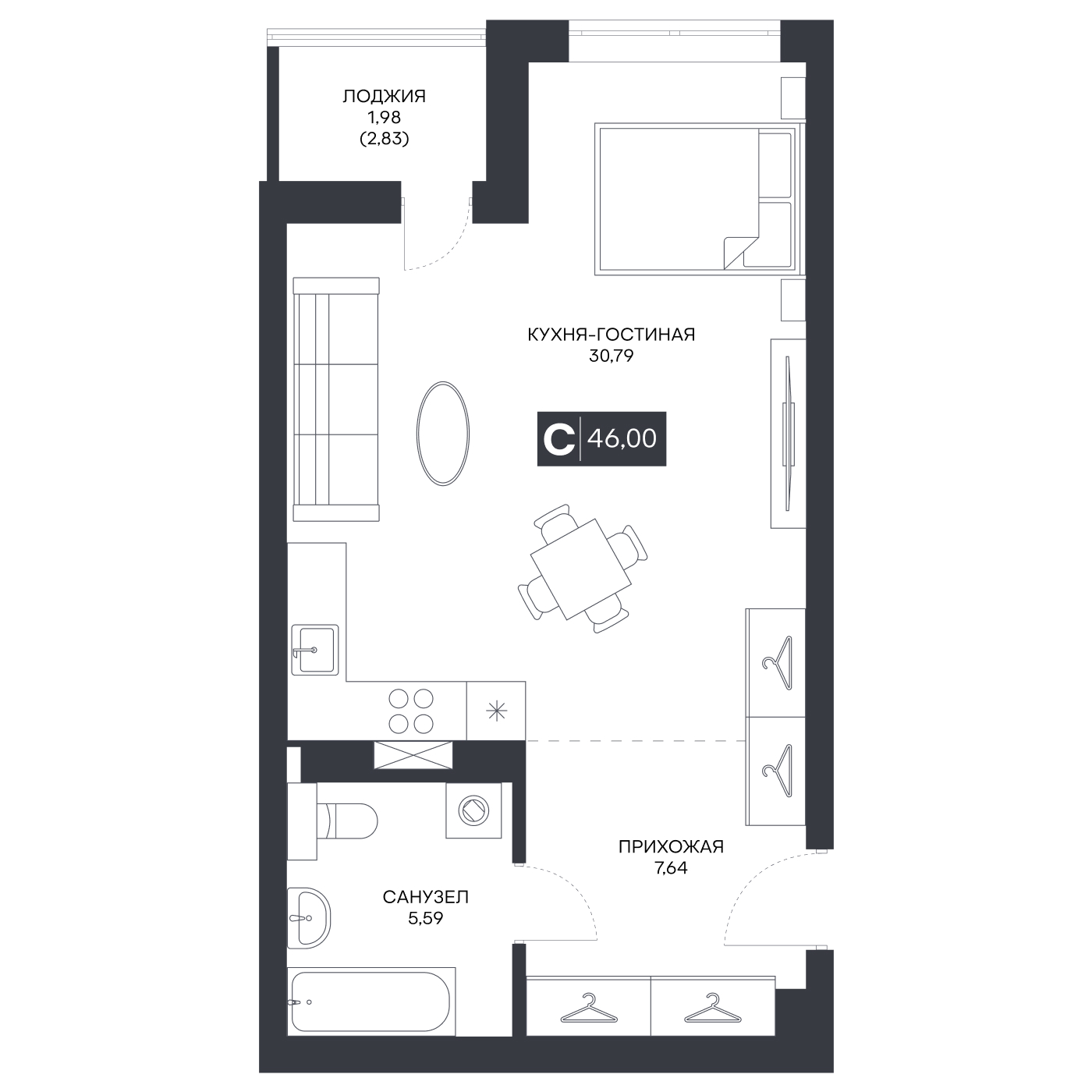 2-комнатная 46 м²