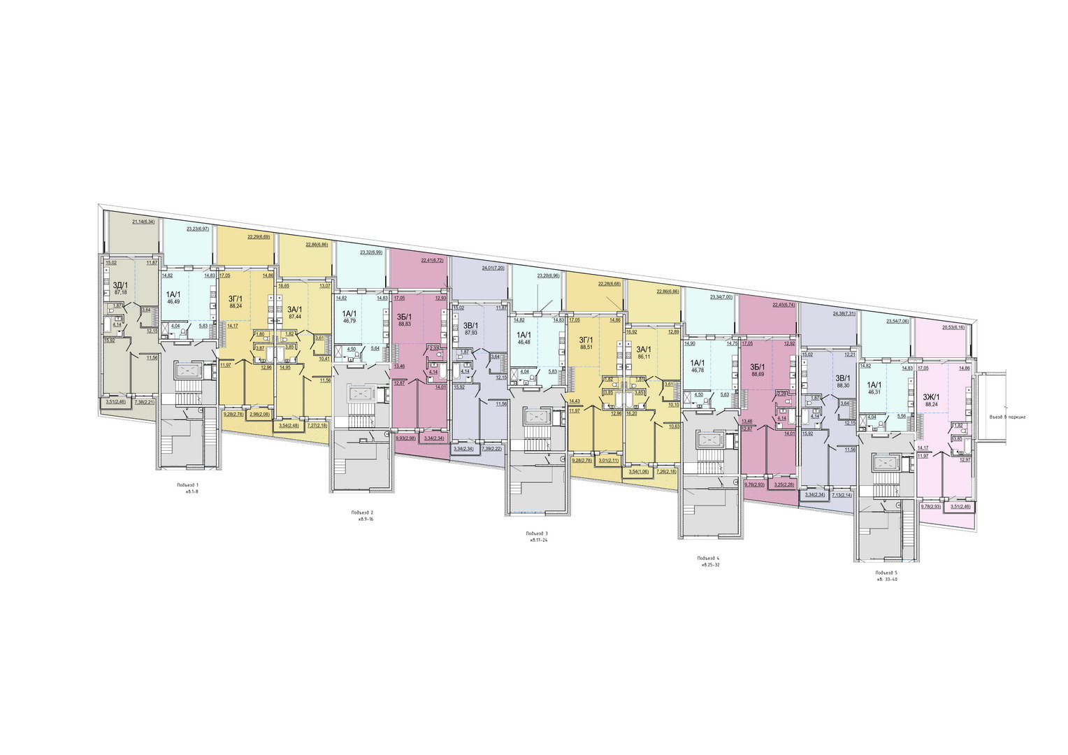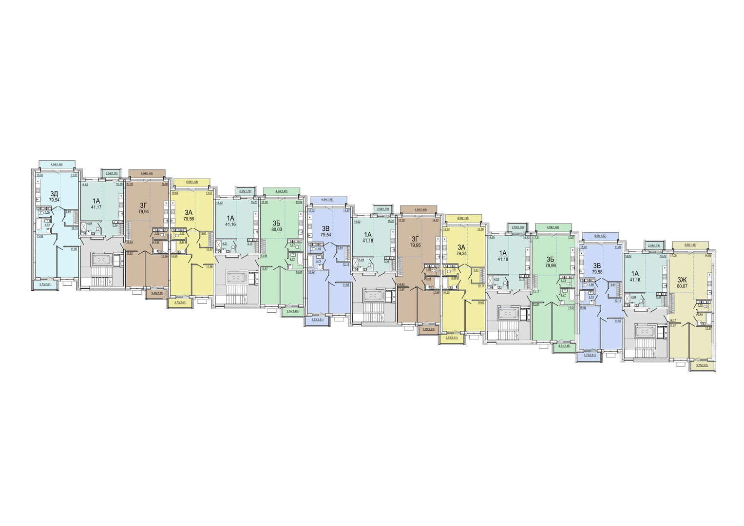 В доме представлены разнообразные планировочные решения от компактных студий до просторных четырехкомнатных квартир, в том числе квартиры со вторым светом и собственными террасами.